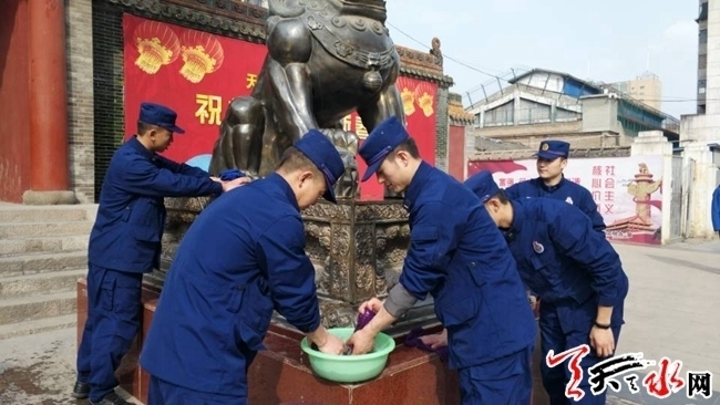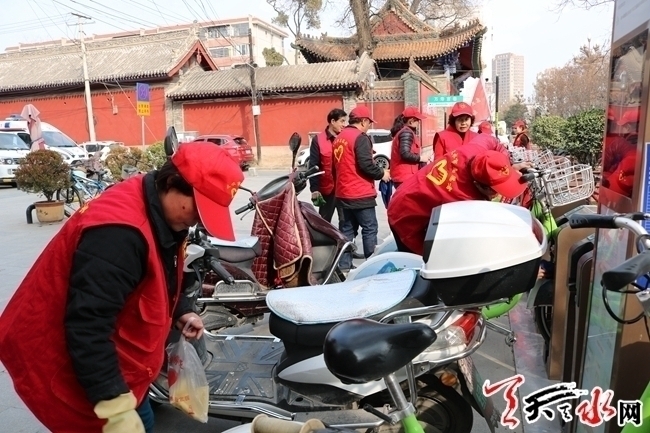 由忠武巷社区干部居民组成的志愿者服务队,身着红马甲,头戴小红帽,走街串巷,慰问社区孤寡老人,帮助老人打扫卫生,擦洗建设路沿街护栏、垃圾桶、自行车等公共设施;由天水消防支队特勤中队指战员组成的志愿者,身着火焰蓝,看望结对帮扶户,擦洗万寿宫前石狮子和沿街护栏;由天水皮肤医院护士组成的志愿者队伍,身着白色护士服,为过往行人免费量血压,进行健康问题解答,发放科普资料……。