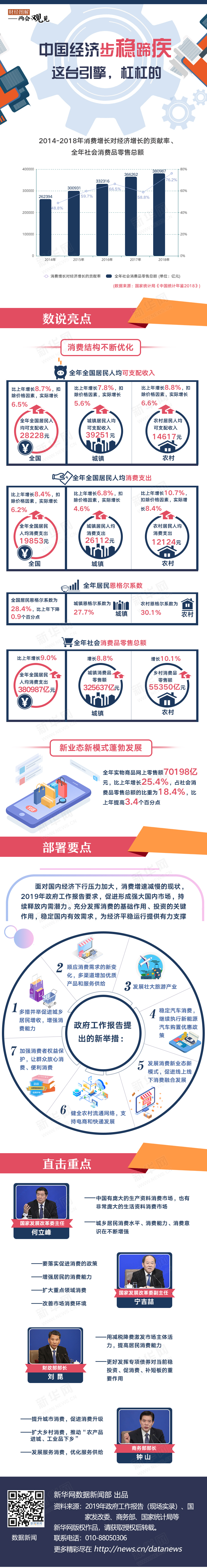 新华网北京3月9日电(刘绪尧 何凡) 2018年消费的增长对经济增长的贡献达到76.2%,已连续五年成为拉动经济增长的主引擎,消费结构不断优化,教育、文化、娱乐、医疗保健等服务消费支出比例稳步提高。当前,我国整个国民经济13.6万亿美元的总量当中,消费总量已超过8万亿美元。未来如何更充分地发挥消费的基础作用?且看政府工作报告如何部署。