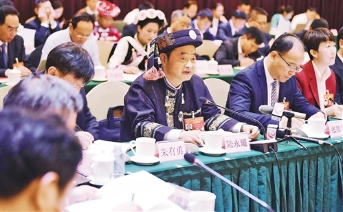 3月10日,人大云南代表团举行全体会议。全国人大代表陆永耀(右三)表示,要实现就业目标,需要探寻就业新路径。经济日报-中国经济网记者 李景录摄