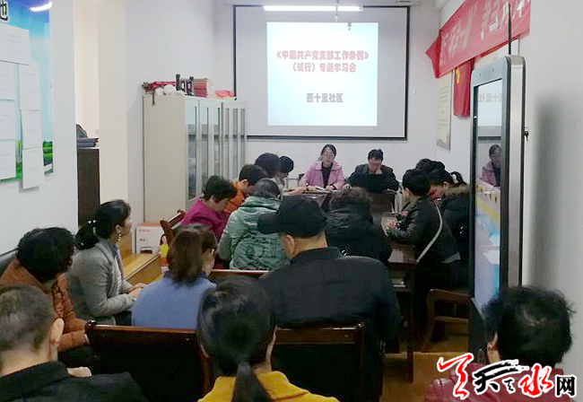 天天天水网讯(通讯员汪文惠)3月12日上午,天水郡街道西十里社区召开专题会议,组织社区党员干部集中学习,迅速掀起学习《条例》的热潮,会议由社区党委书记汪文惠主持。
