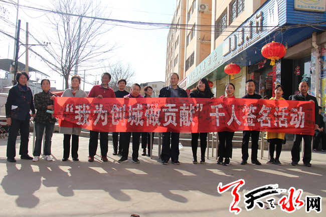 天天天水网讯(通讯员吴娟)为积极开展创建全国文明城市工作,提升社区居民对文明城市创建的知晓率,参与度,营造浓厚的创建氛围。3月18日下午,天水郡街道王家磨社区在安民家园门口举行了“我为创城做贡献”千人签名活动。