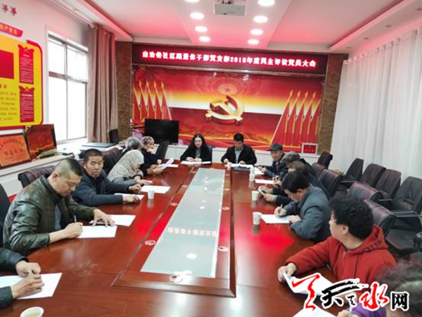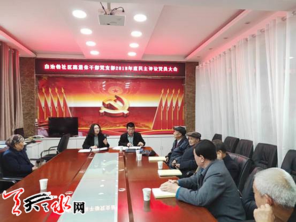 天天天水网讯(通讯员 安冬梅)3月19日上午,自治巷社区离退休干部党支部召开组织生活会和民主评议党员大会。会议由支部书记赵建荣主持,街道党建办主任何小英应邀参加指导会议,离退休干部党支部全体党员参加会议。