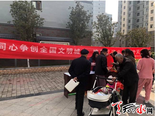 本次活动通过向居民群众发放《天水市创建全国文明城市倡议书》、《天水市市民文明公约》、《致广大市民朋友的一封信》等形式,向社区居民大力宣传创建全国文明城市,文明礼仪知识,讲解争创全国文明城市的重要意义,倡议社区居民从我做起、积极参与、文明礼让、志愿服务、守法诚信、节能环保,共建文明城市,共享幸福生活。