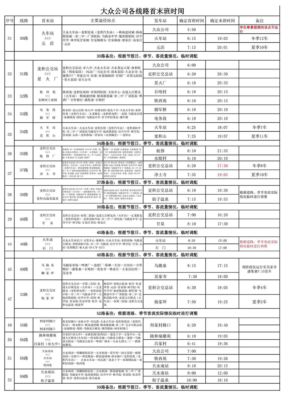 天水羲通公交旅游集团大众公司各线路首末班时间
