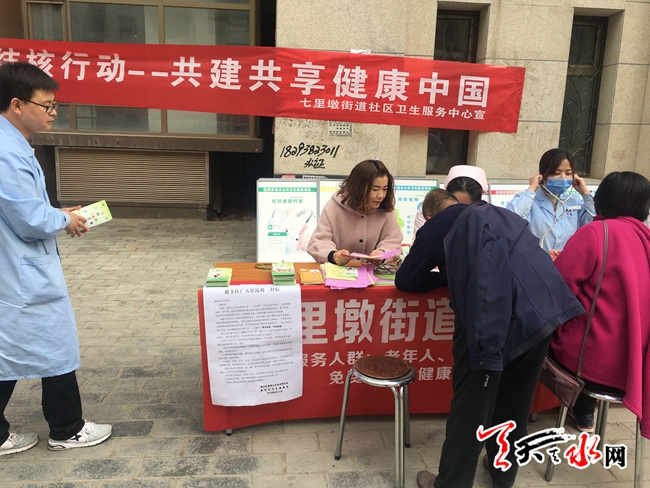 3月22日9时,秦州区七里墩五里铺社区联合七里墩街道社区卫生服务中心,共六名工作人员,在香榭丽舍小区门口开展“终结结核行动—共建共享健康中国”的宣传活动,并设立咨询台,开展免费义诊,工作人员认真接待每一位居民,介绍结核病的预防、可疑症状及治疗程序。