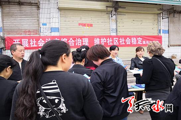 天天天水网讯(通讯员 韩雪梅)为进一步提高辖区居民对社会治安综合治理工作的知晓率、参与率、满意率,4月18日上午,瀛池社区开展了以“社会治安综合治理、维护社区社会稳定”为主题的宣传教育活动。