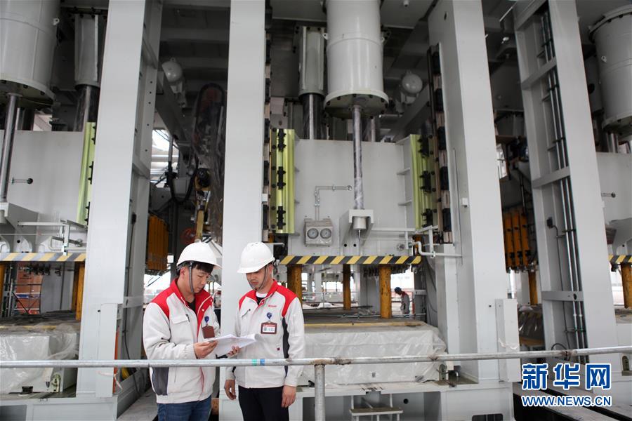 在重庆市永川高新区凤凰湖产业园的永川长城汽车基地,工程技术人员在压力机前查看资料(3月26日摄)。新华社发(陈仕川摄)