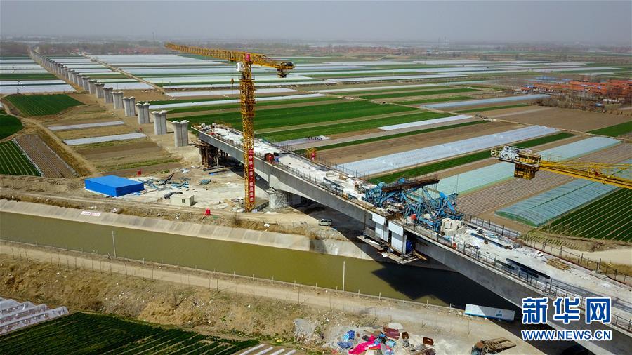在山东省平度市明村镇,潍莱高铁跨胶东调水渠100米连续梁合龙(4月5日无人机拍摄)。新华社记者 郭绪雷 摄