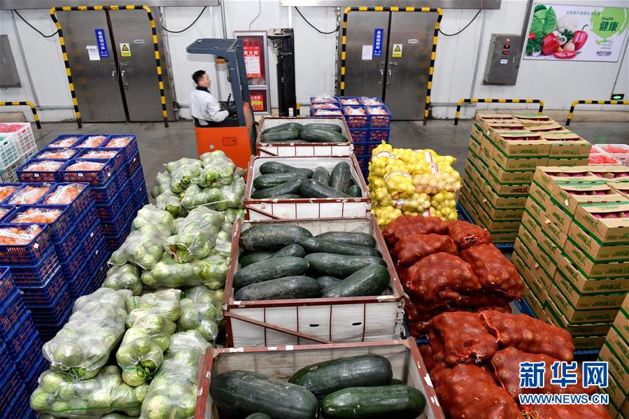 在山东潍坊市寒亭区中百大厨房,工作人员在搬运蔬菜(2月16日摄)。 新华社记者 郭绪雷 摄