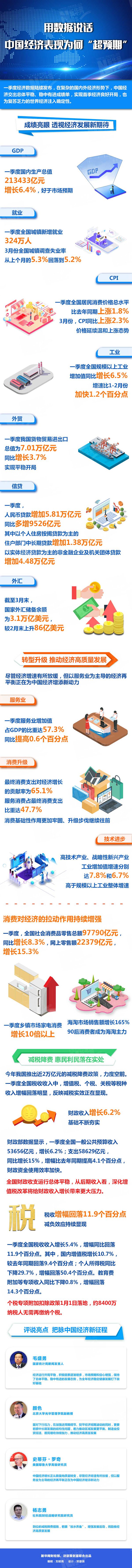 一季度,工业增加值、消费和投资增速均比前两月有所加快,GDP同比增长6.4%,好于市场预期;3月份全国城镇调查失业率从上个月的5.3%回落到5.2%,一季度全国城镇新增就业324万人;居民消费价格延续温和上涨态势,市场供求关系在平衡改善;3月末外汇储备较2月末上升86亿美元……经济增长、就业、物价、国际收支都呈现稳的态势。