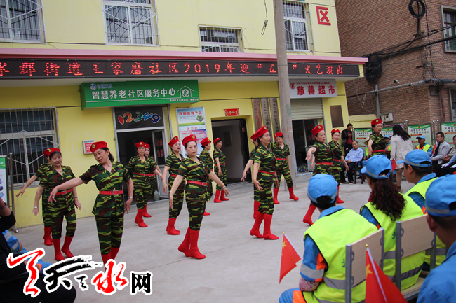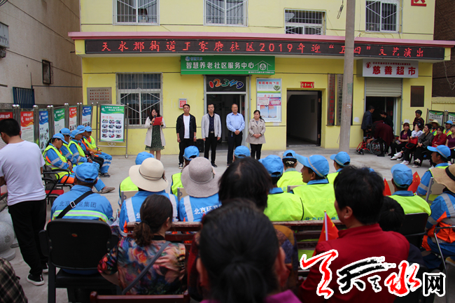 天天天水网讯(通讯员吴娟)4月29日下午,在“五一”劳动节和“五四”青年节到来之际,为了促进社区精神文明建设,丰富社区居民的文化生活,拉近社区居民邻里之间的关系,推动社区和谐发展,天水郡街道王家磨社区组织开展了一场热闹喜庆又丰富多彩的庆“五一、迎五四”文艺演出活动,街道领导、社区干部、社区民警、交警、环卫工人与辖区居民群众共计200余人参加。