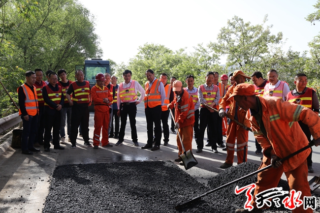 天天天水网讯(通讯员 湖泽庭) 4月30日,天水市干线公路养护油路修补现场观摩会在天水公路局管养的国道247线景昭公路(原国道310线天巉公路)召开。来自全市各县区干线公路养护管理单位的40余名专业技术人员参加了现场观摩。