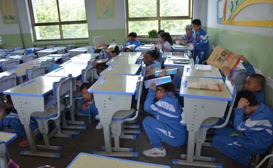 在第二阶段长城中学活动现场,首先进行了避震演练,班主任介绍地震来临时正确避险方法,当报警声音响起,各班班主任发出“躲避地震”口令,学生听到口令后双手抱头迅速钻入课桌下,当警报再次响起,高年级学生进行消防疏散演习,在老师的带领下有序的从教室疏散到操场,猫腰用小毛巾捂住口鼻行进,撤离出教学楼的学生到达操场集合地后迅速下蹲并作双手抱头姿势,然后各班应立即清点人数。