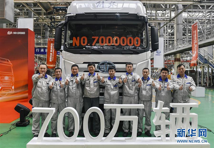 一汽解放职工与第700万辆解放卡车合影留念(2018年11月30日摄)。 新华社记者 许畅 摄