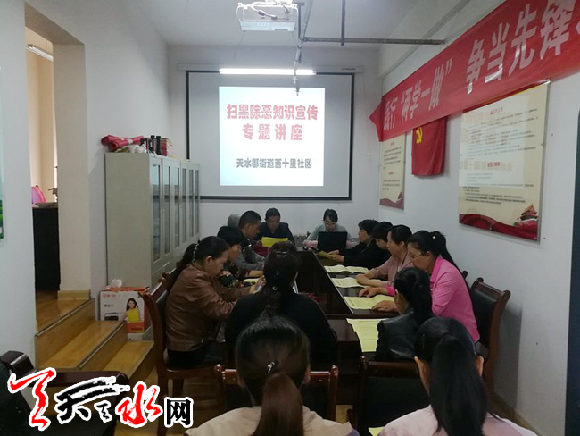 天天天水网讯(通讯员汪文惠)为深入推进扫黑除恶专项斗争工作的宣传,保障居民安居乐业,有效震慑黑恶势力犯罪行为。5月17日,天水郡街道西十里社区组织辖区居民群众开展扫黑除恶知识宣传专题讲座活动。