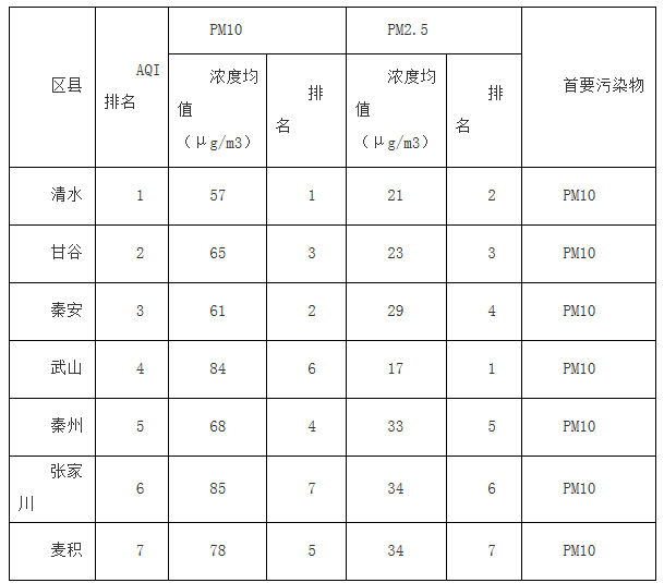 可吸入颗粒物(PM10)浓度均值最高85微克/立方米,最低57微克/立方米,按从高到低排序依次是:清水、秦安、甘谷、秦州、麦积、武山、张家川。