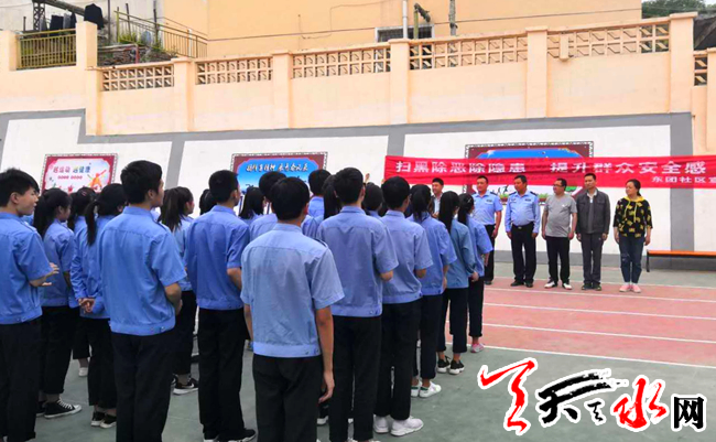 天天天水网讯(通讯员宋钰)为认真贯彻落实中央、省、市、区“扫黑除恶”文件精神,推进“扫黑除恶”专项斗争工作纵深开展,不断提升群众对“扫黑除恶”专项斗争的关注度、知晓率,进一步增强天水技校全体师生遵纪守法意识,切实保护大家的合法权益,确保校园和谐平安,石马坪街道东团庄社区、石马坪派出所积极走进天水技校开展扫黑除恶专项斗争系列宣传活动。