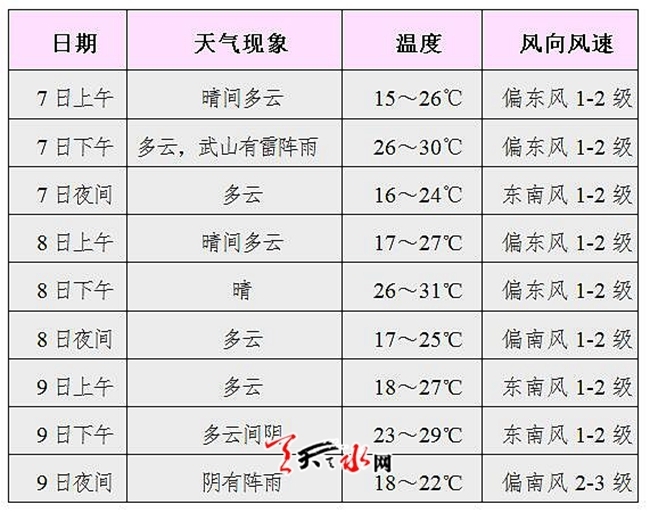 具体天气预报:7日晴间多云,最低气温13—16℃,最高气温27—31℃。8日晴间多云,最低气温14—17℃,最高气温26—30℃。9日多云间阴,最低气温15—18℃,最高气温26—29℃。
