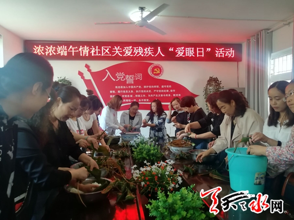 天天天水网讯【通讯员梁兰英】在“全国爱眼日”到来之际,6月5日上午秦州区七里墩街道办岷山社区书记带领社区干部在社区一楼会议室组织开展了“呵护眼睛、从我做起”关爱残疾人包粽子活动。