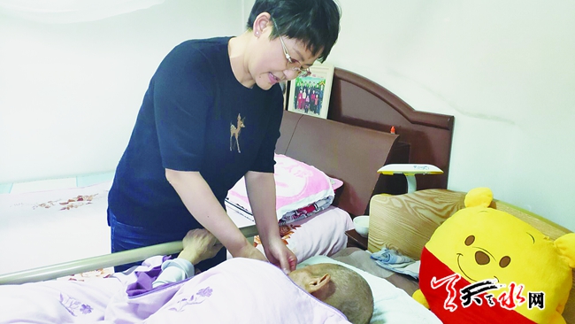 6月26日下午,记者如约来到刘海峡家,其时她正在为卧病在床的父亲翻身。简单的两居室,收拾得井井有条,最吸引人眼球的是摆放在客厅窗台上的一排奖杯和奖牌:有“当代中国十大母亲”、天水市三八红旗手等。