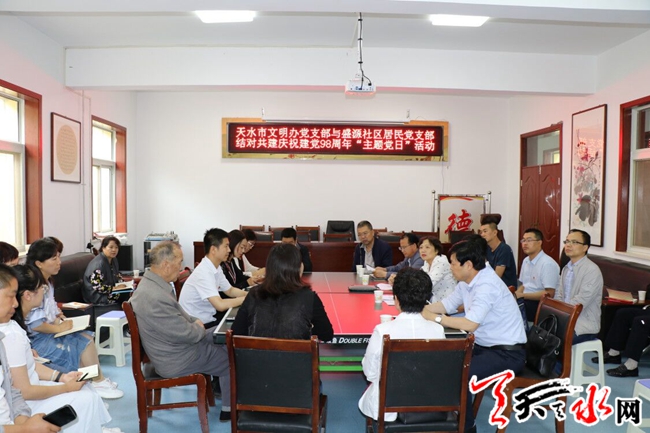 天天天水网讯(通讯员马 迅)6月28日,在“七一”建党节来临之际,市文明办党支部组织全体党员深入秦州区盛源小区居民党支部开展庆祝建党98周年“主题党日”活动,市文明办全体党员和盛源小区居民党支部全体党员参加活动。