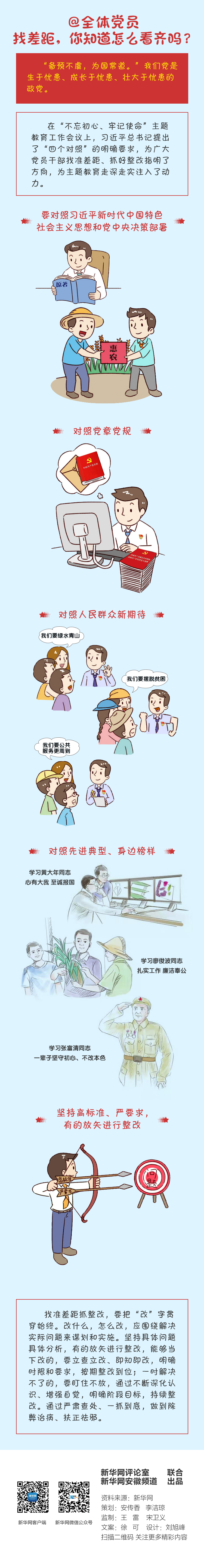 差距不找不明,问题不攻不破。开展“不忘初心、牢记使命”主题教育,找差距是要牢牢把握的总要求之一。找差距,就是要对照习近平新时代中国特色社会主义思想和党中央决策部署,对照党章党规,对照人民群众新期待,对照先进典型、身边榜样,坚持高标准、严要求,有的放矢进行整改。