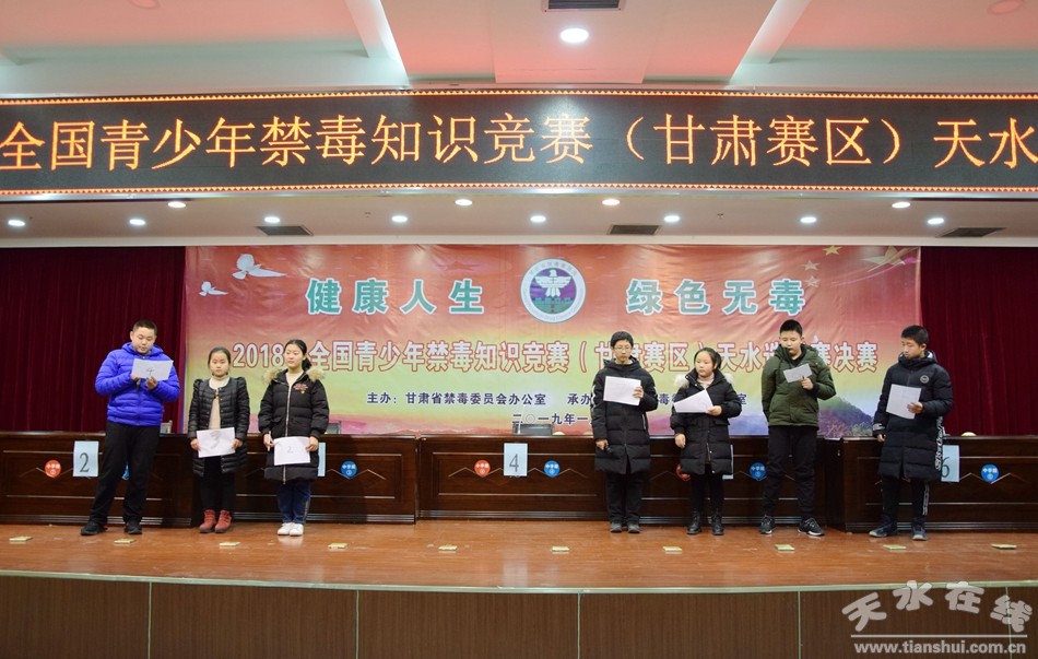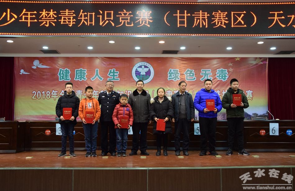 1月14日下午,由甘肃省禁毒办主办、天水市禁毒办承办,以“健康人生、绿色无毒”为主题的全国青少年禁毒知识竞赛(甘肃赛区)天水选拔赛决赛在市公安局举办。省禁毒办副主任李岁来出席活动并致辞。市禁毒委副主任、市公安局副局长桐向东,市禁毒办专职副主任刘士杰为获奖选手颁奖。