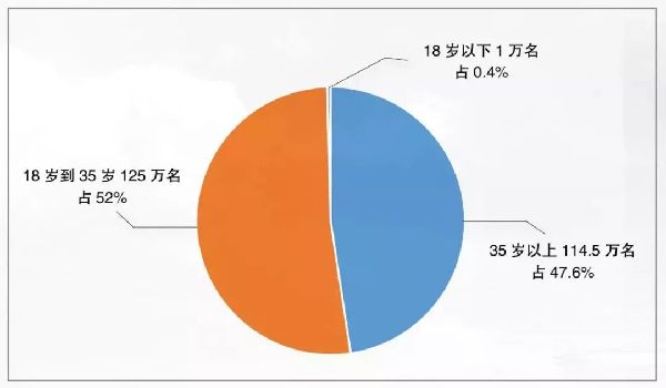 ——毒品滥用人数增速减缓但规模依然较大,新增吸毒人员减少。截至2018年底,全国现有吸毒人员240.4万名(不含戒断三年未发现复吸人数、死亡人数和离境人数),同比下降5.8%。其中,35岁以上114.5万名,占47.6%;18岁到35岁125万名,占52%;18岁以下1万名,占0.4%。2018年新发现吸毒人员同比减少26.6%,其中35岁以下人员同比下降31%,有30个省(自治区、直辖市)涉毒违法犯罪人员中未成年人所占比例下降,青少年毒品预防教育成效继续得到巩固。