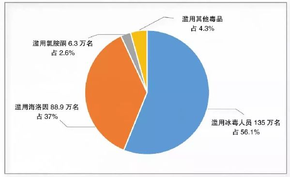 —— 冰毒成为滥用“头号毒品”,大麻滥用人数增多。在240.4万名现有吸毒人员中,滥用冰毒人员135万名,占56.1%,冰毒已取代海洛因成为我国滥用人数最多的毒品;滥用海洛因88.9万名,占37%;滥用氯胺酮6.3万名,占2.6%。大麻滥用继续呈现上升趋势,截至2018年底,全国滥用大麻人员2.4万名,同比上升25.1%,在华外籍人员、有境外学习或工作经历人员及娱乐圈演艺工作者滥用出现增多的趋势。