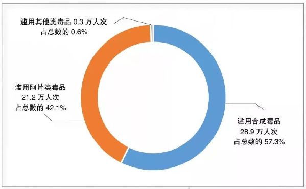 ——复吸人员滥用合成毒品占主流,交叉滥用者更加突出。混合滥用合成毒品和阿片类毒品交叉滥用情况突出,截至2018年底达31.2万名,同比上升16.8%,占现有吸毒人员总数的12%。2018年,全国查获复吸人员滥用总人次50.4万人次,其中滥用合成毒品28.9万人次,占总数的57.3%;滥用阿片类毒品21.2万人次,占总数的42.1%。