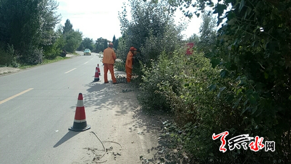 天天天水网讯(通讯员 刘志伟)进入夏季以来,武山县境内雨量充沛,气温明显升高,公路两侧行道树生长茂盛,部分树枝遮挡公路标志牌,易造成过往驾驶员行车视线模糊,影响到交通安全畅通。