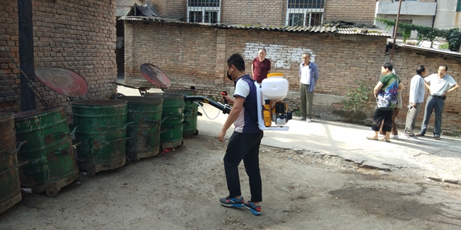 工作开展前,社区工作人员首先在辖区向居民宣传消杀工作的重要性,并在小区公示栏进行张贴,提醒辖区居民注意保护小孩和宠物安全。在喷洒药物时,喷洒人员不惧炎热,对辖区内绿化带、垃圾桶,水渠等采取一天两次集中消杀,做到干净彻底。