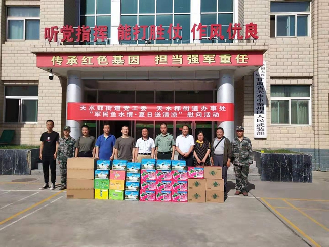 天天天水网讯 为纪念中国人民解放军建军92周年,在“八•一”建军节来临之际, 进一步深入开展双拥工作,落实各项优抚政策,巩固新时代的军民关系。7月31日上午,秦州区天水郡街道党工委、暖和湾社区党委在秦州区人民武装部开展“军民鱼水情,夏日送清凉”为主题的慰问活动。