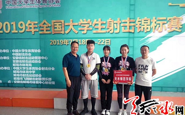 天天天水网讯【记者辛磊】 7月31日,记者采访获悉,近日,2019年全国大学生射击锦标赛在安徽省蚌埠市奥体中心举行。天水师院2016级运动训练专业学生黄天琪获得甲组10米气步枪金牌、50米步枪卧射铜牌;2018级运动训练学生杨玉莹与重庆师范大学黄新寓组队参赛,摘得10米气步枪混合团体金牌。