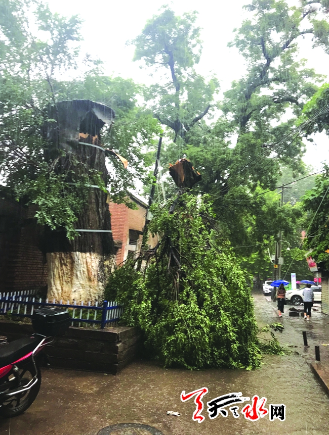 天天天水网讯【记者杨颖】8月2日,天水市普降大雨,在秦州区忠武巷内,一株古树因大雨侵袭而断裂,树干倒在了巷道中。