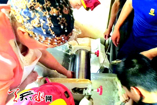 天天天水网讯【记者张彬霞】清水县一名妇女在操作压面机时,一时大意将手卡在了滚轴处不得动弹。还好,消防员第一时间赶到现场进行了处置,妇女脱险后被送医。