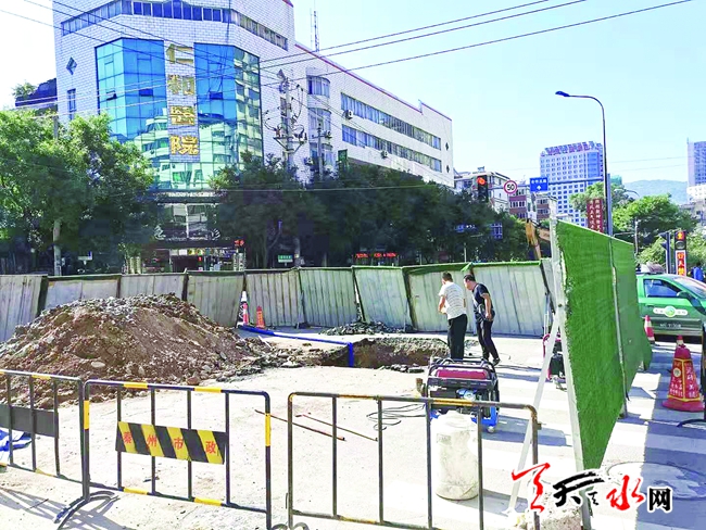 8月10日9时许,记者途经秦州区合作北路十字路口时看到,因道路塌陷原因,交警设置警示标志和围挡对路段进行管控,并在现场疏导交通。12日下午,记者再次来到现场时,绿色围挡已将施工现场封闭起来,市政设施部门正在抢修施工。