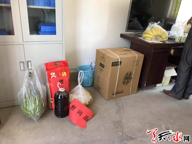 天水郡街道为村干部及驻村队员们带来了米面油水果等慰问品。并为兴隆村村委会捐赠了两台电风扇。