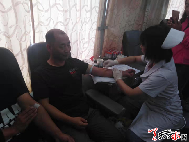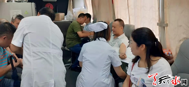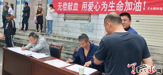 天天天水网讯 (通讯员 吴娟)8月21日上午,在天水郡街道办事处的统一安排下王家磨社区积极组织社区干部、辖区居民、志愿者在办事处门口积极参与义务献血活动,进一步普及无偿献血和血液安全知识,鼓励更多的人加入到无偿献血的队伍。
