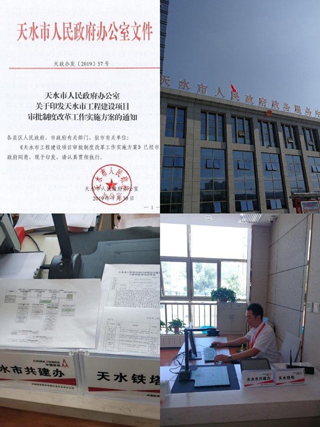 为贯彻落实《甘肃省人民政府办公厅关于印发甘肃省工程建设项目审批制度改革工作实施方案的通知》(甘政办发〔2019〕60号)和《甘肃省人民政府办公厅关于进一步支持5G通信网络建设发展的意见》(甘政办发〔2019〕72号)等文件精神,深化“放管服”优化发展环境,抢抓本次工程建设项目审批制度改革机遇,全面改善通信基础设施建设环境,加快推进我市5G网络等通信基础设施规范建设,根据天水市政府《天水市工程建设项目审批制度改革工作实施方案》(天政办发〔2019〕57号)文件要求,在市工信局牵头组织下,中国铁塔天水分公司(通信业共建办常务副主任单位)成功派驻人员入驻政务大厅,开创了天水市建筑物通信基础设施“一个窗口”集中审批的新模式,有效嵌入工程项目审批中的审图及验收环节,提升了通信设施建设效率,增强了社会资源的免费获取与统筹能力,助力通信行业共享发展,为天水市5G快速规划建设发挥重要作用。