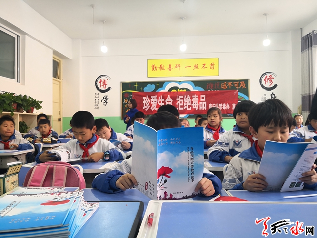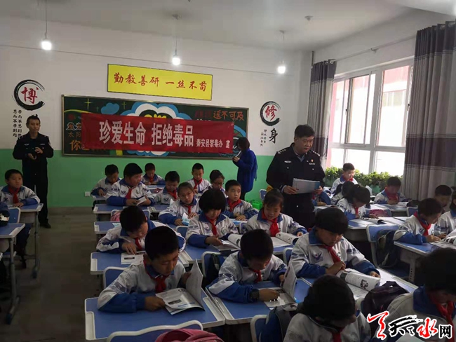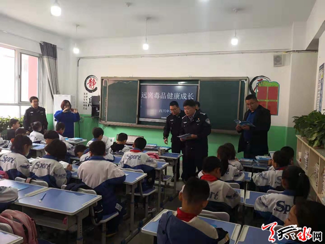 天天天水网讯 为深入推进青少年毒品预防教育工作,提高广大师生识毒、拒毒和防毒能力,10月8日,秦安县禁毒办联合教育局西川派出所深入西川镇中心小学开展禁毒宣传活动,为在校学生上了一堂生动的禁毒课。