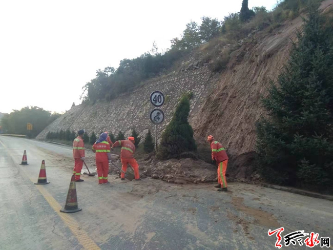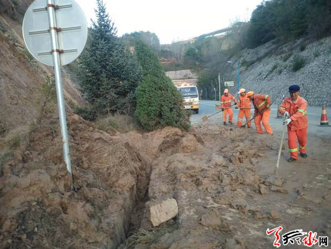 10月14日,天水公路局高养中心巡查发现后,立即出动养护人员及车辆赶赴现场,布设安全警示标志,指挥引导车辆缓慢通行,同时进行清理抢通。经过近2小时作业,G247线景昭公路路面泥石流及边沟淤积全部清理完毕,道路恢复双向正常通行。