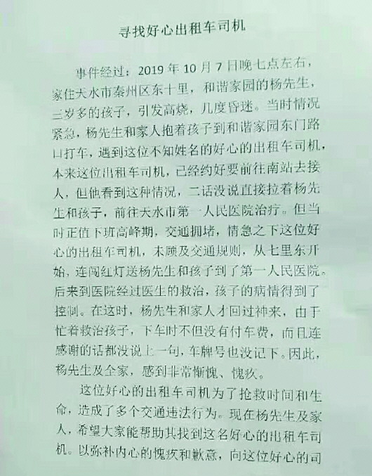 近日,部分市民在微信朋友圈看到一则特殊的寻人启示:“寻找好心出租车司机 2019年10月7日晚上七点左右,家住天水市秦州区东十里和谐家园的杨先生,三岁多的孩子突发高烧,几度昏迷。杨先生和家人抱着孩子到和谐家园东门路口打车,遇到这位不知名的好心出租车司机。原本这位出租车司机已经约好要前往南站接人,但他看到这种情况,二话没说直接载着杨先生和孩子,前往天水市第一人民医院治疗……”