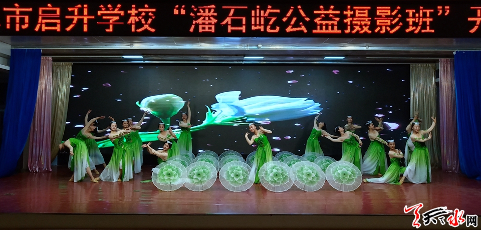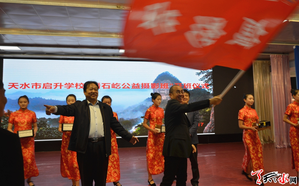 开班仪式上,启升中学董事长羊正宁为潘石屹先生颁发了“潘石屹公益摄影课堂”荣誉班主任证书并授牌,潘石屹为摄影班授班旗并给学生赠送爱心资助照相机,随后一同观看了启升中学艺术生的才艺表演。