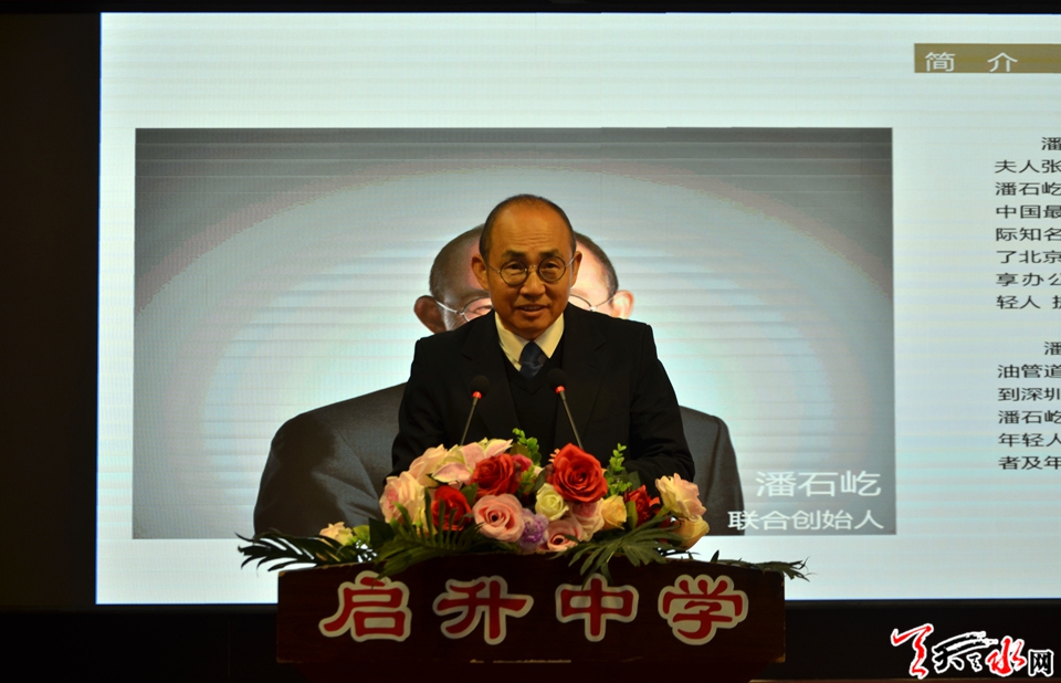 麦积区委常委、宣传部部长阎小鹏讲话时说,“潘石屹公益摄影课堂”的开班,这不仅是启升中学的一件喜事,也是麦积区教育事业发展的一件大事。麦积区教育事业的持续快速发展,凝聚着全区各级党政组织和广大教育工作者多年的心血,也离不开潘石屹先生等一批爱心人士长期以来的关心和支持。他相信,在潘石屹的大力支持下,公益摄影班一定会越办越好,必将使学校教育资源更加完善,育人途径更加丰富,发展更加广阔。