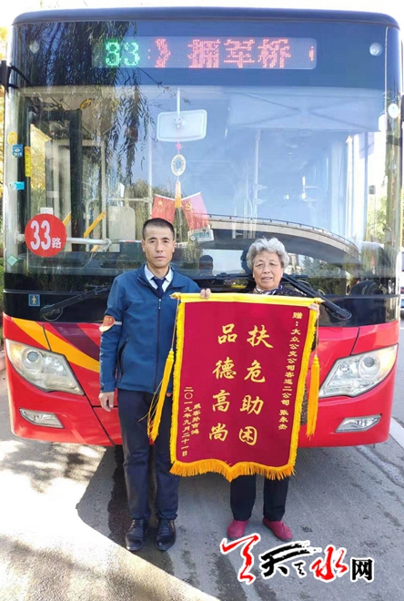 天天天水网讯(见习记者罗馨)10月17日上午,郭女士来到天水市大众公共交通有限公司,为33路公交车司机张永杰送上一面题为“扶危助困,品德高尚”的锦旗,感谢张永杰将晕倒的老伴送往医院救治。