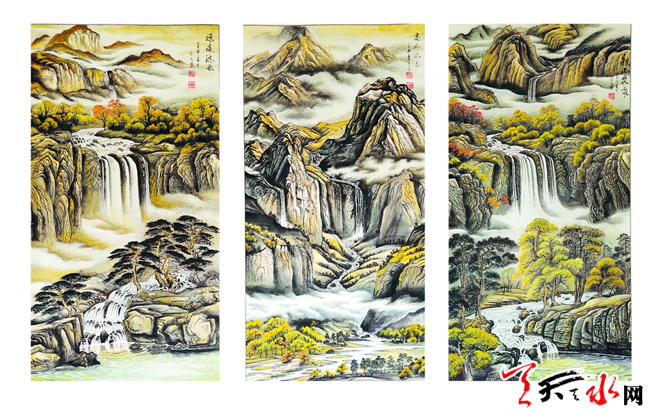 推开门,阳光正好洒在画案一幅未完成的画作上,带有墨迹的毛毡,青花瓷的笔洗……画室西面的墙上挂着三幅山水画,云山雾罩里,有潺潺清泉流出,画中的色彩正似这秋天的一片灿烂金黄。