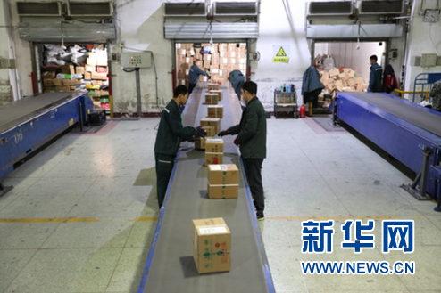 11月10日晚,网购的苹果经中国邮政的苹果直通邮路抵达兰州市,进行下一步的分拣和邮寄。杜哲宇 摄