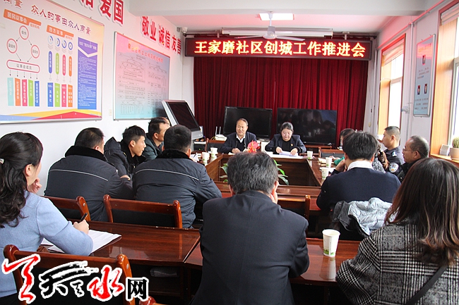 天天天水网讯(通讯员吕艳红)距离创建全国文明城市验收工作越来越近,为继续深入推进全国文明城市创建工作,确保顺利通过中央文明办测评组的考核验收,11月19日下午,天水郡街道王家磨社区召集天水市三院、市卫校、安宁小学、天水郡派出所、黄河水文站、海星幼儿园、执法局西关中队以及辖区物业公司等20余名辖区单位干部职工召开了创建全国文明城市工作推进会,王家磨社区党委书记吕艳红主持了本次会议。