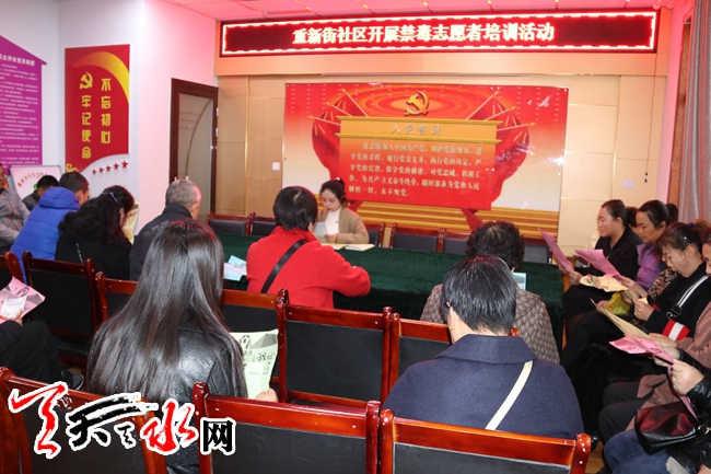 天天天水网讯 为了充分发挥禁毒志愿者在禁毒工作中的宣传帮教作用,提升志愿者的业务能力及工作积极性,激发更多的志愿者参与到禁毒斗争中来,2019年11月27日,重新街社区在会议室召开禁毒志愿者培训会。